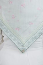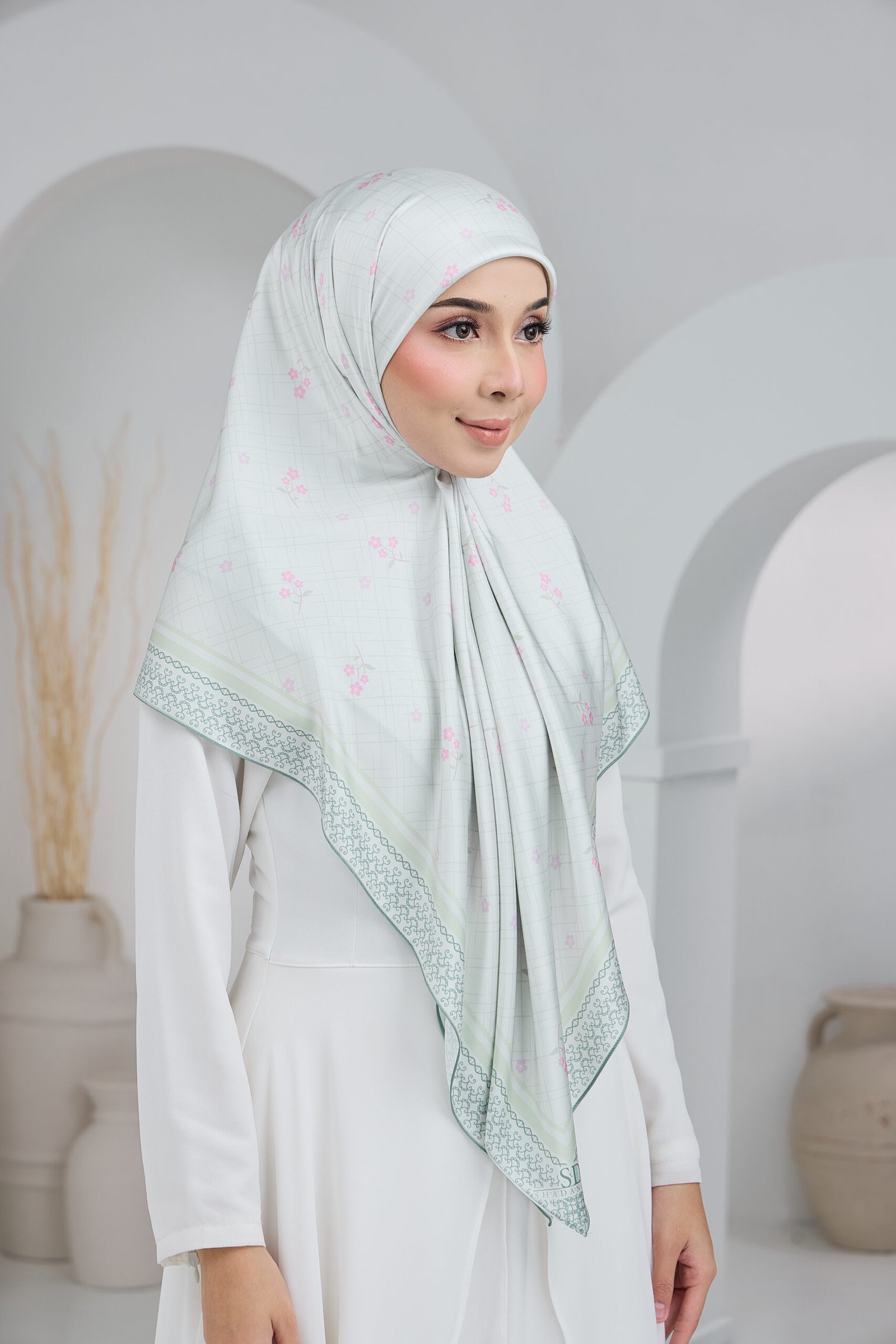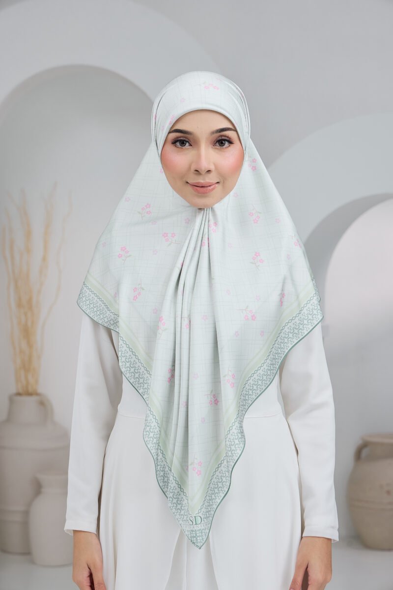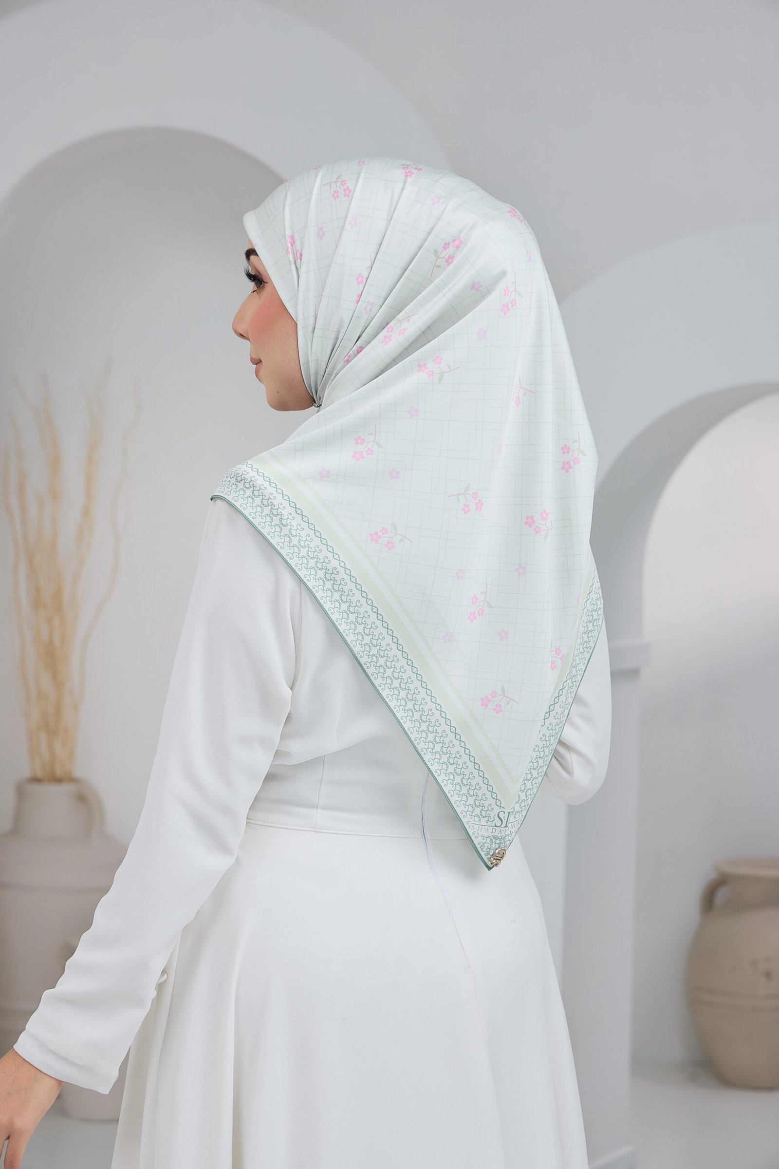 Cahaya Puteri features a soft, graceful composition inspired by delicate blossoms set against a subtle checkered backdrop, creating a light and airy visual flow. The scattered floral accents add a gentle feminine touch while keeping the overall look clean and understated.