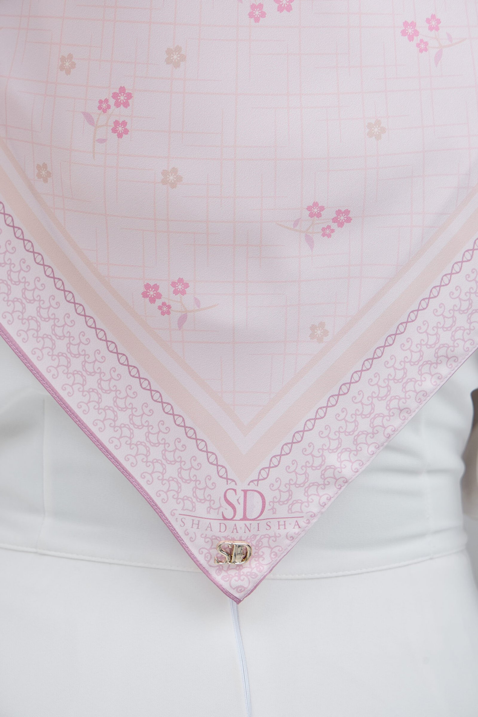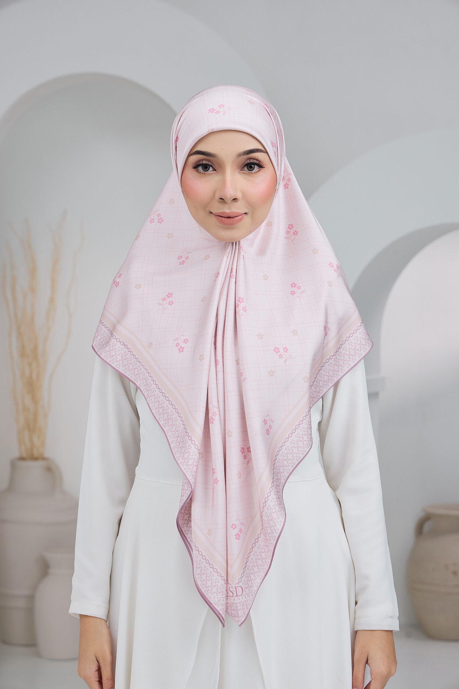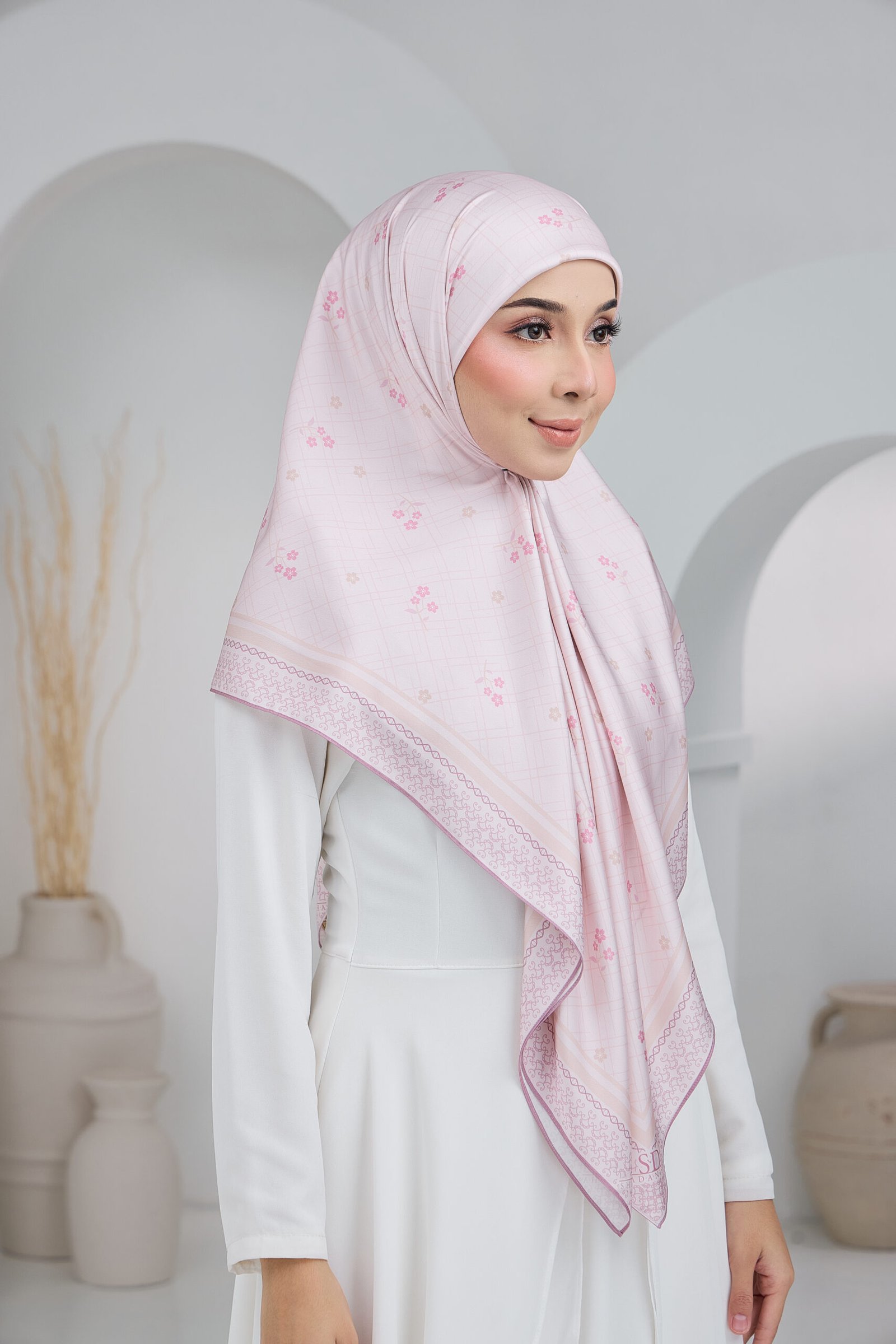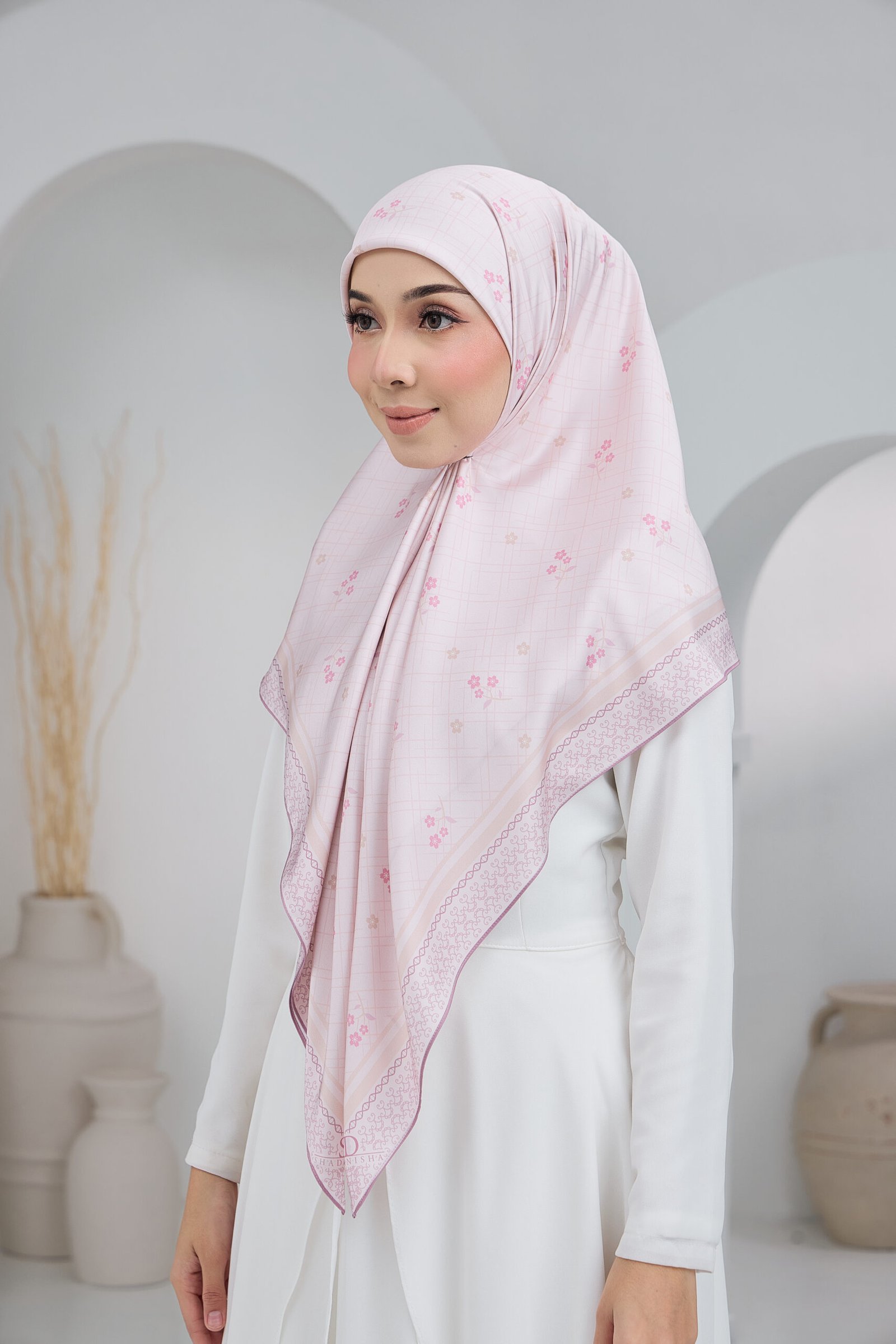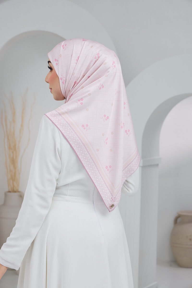 Cahaya Puteri features a soft, graceful composition inspired by delicate blossoms set against a subtle checkered backdrop, creating a light and airy visual flow. The scattered floral accents add a gentle feminine touch while keeping the overall look clean and understated.