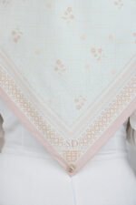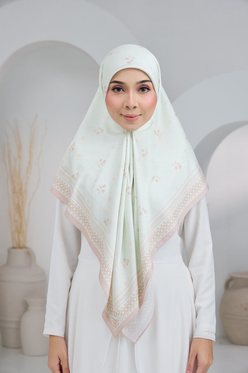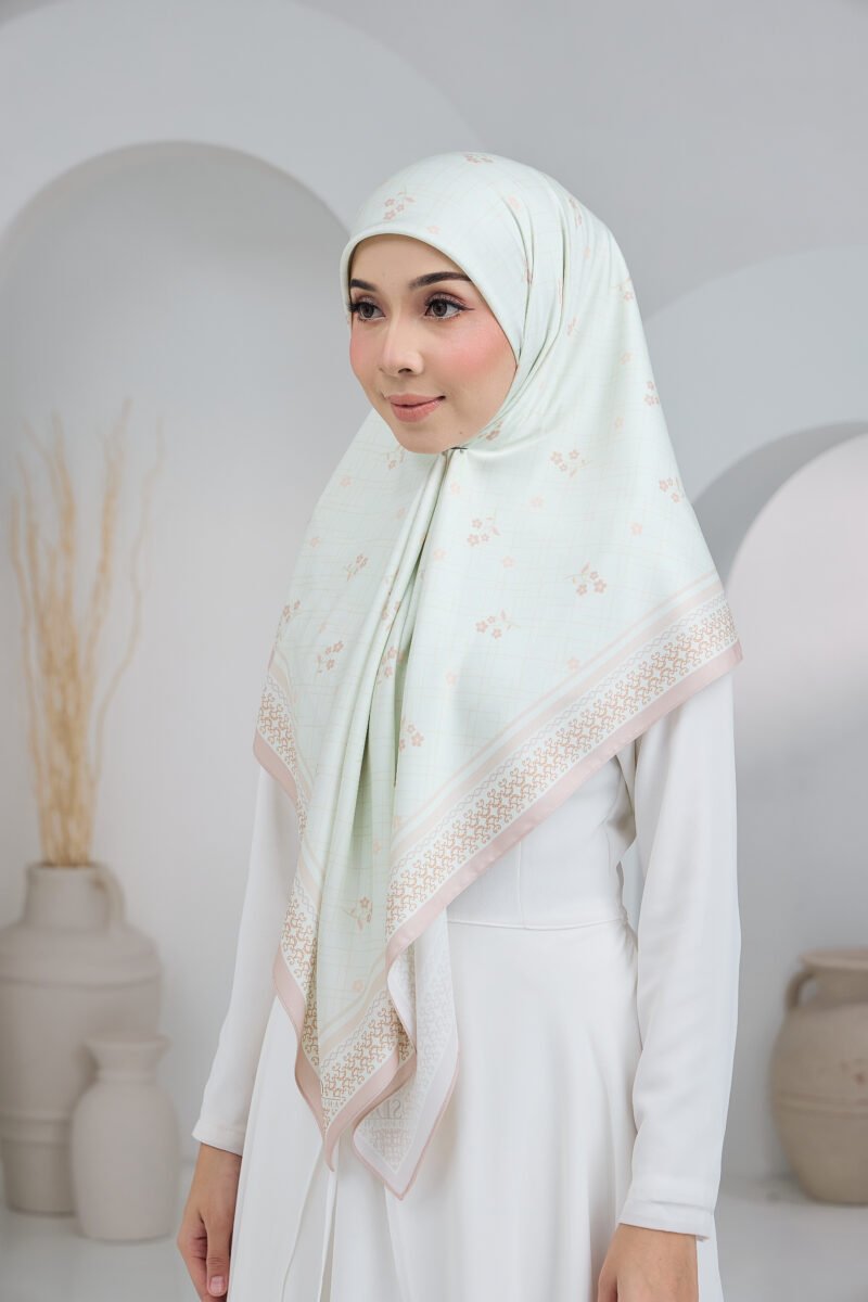 Cahaya Puteri features a soft, graceful composition inspired by delicate blossoms set against a subtle checkered backdrop, creating a light and airy visual flow. The scattered floral accents add a gentle feminine touch while keeping the overall look clean and understated.