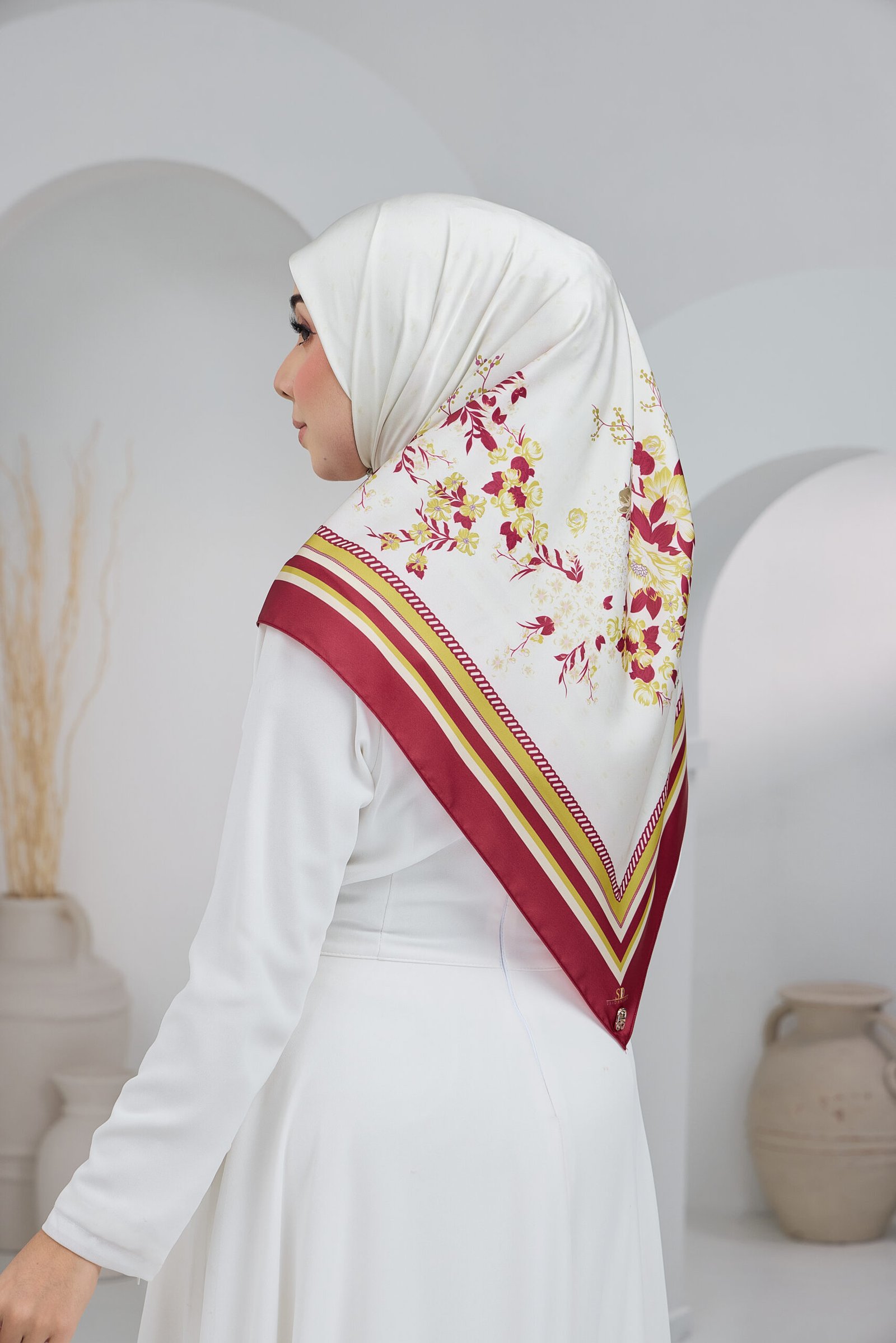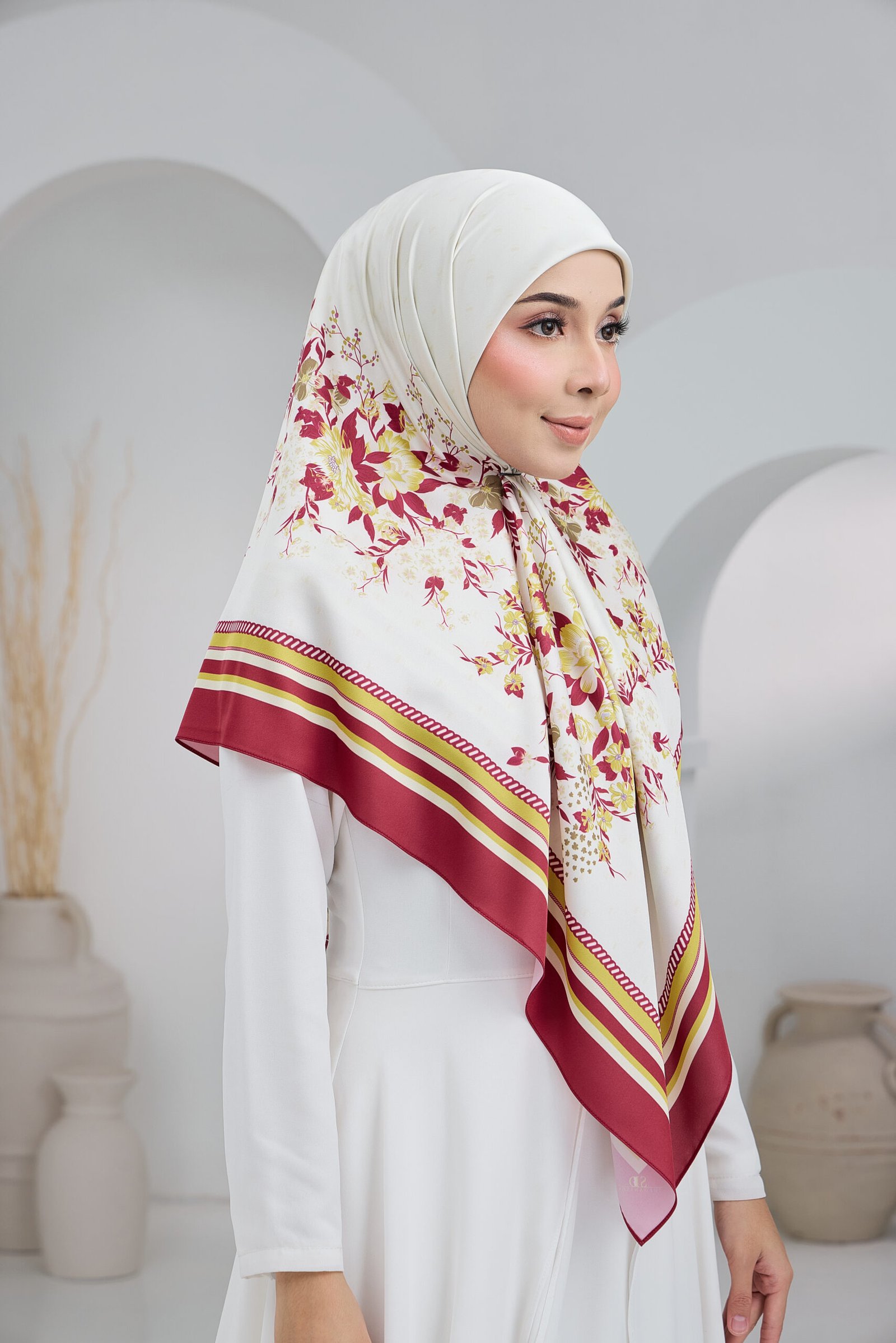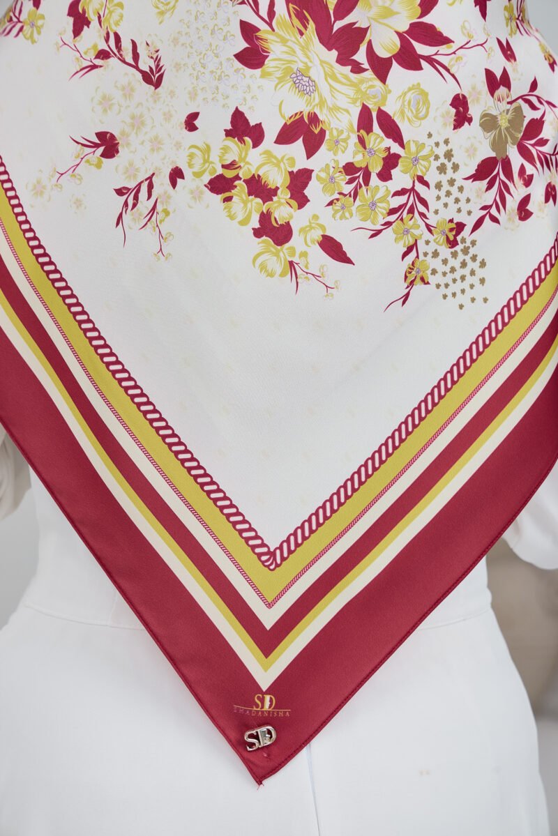 Cahaya Rindu showcases an elegant floral composition inspired by soft, blooming petals layered over a subtle monogram background for a refined, premium look. The flowing botanical motifs create a gentle visual movement that adds femininity without overwhelming the overall design.