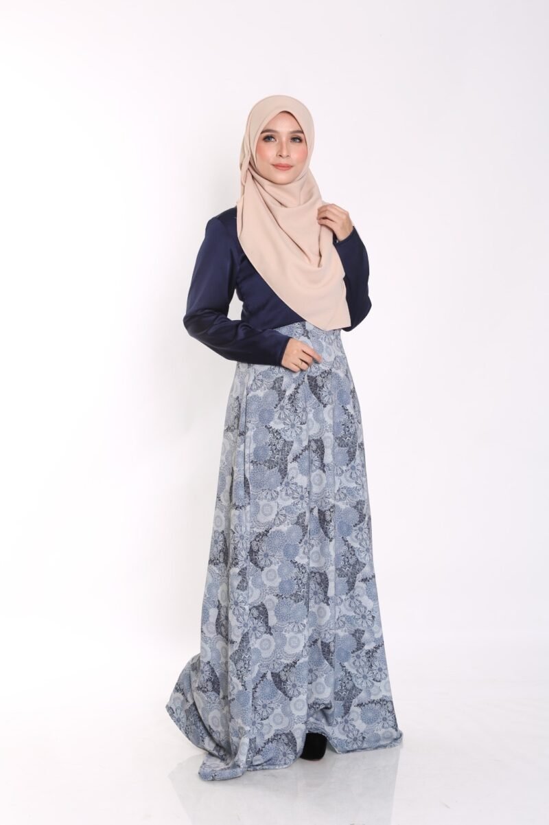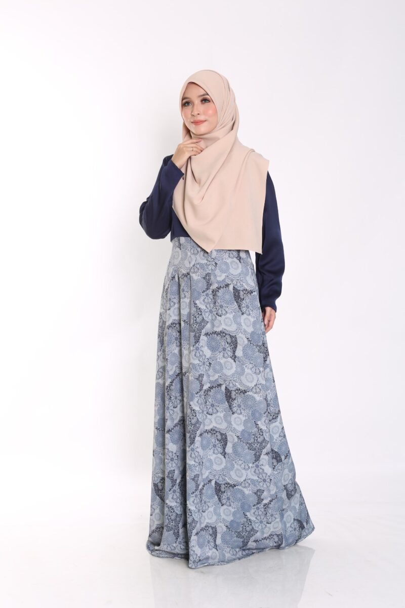 This elegant jubah features a minimalist solid top paired with a flowy floral skirt, creating a flattering and feminine silhouette. Designed for comfort and effortless style, it drapes beautifully with every movement.