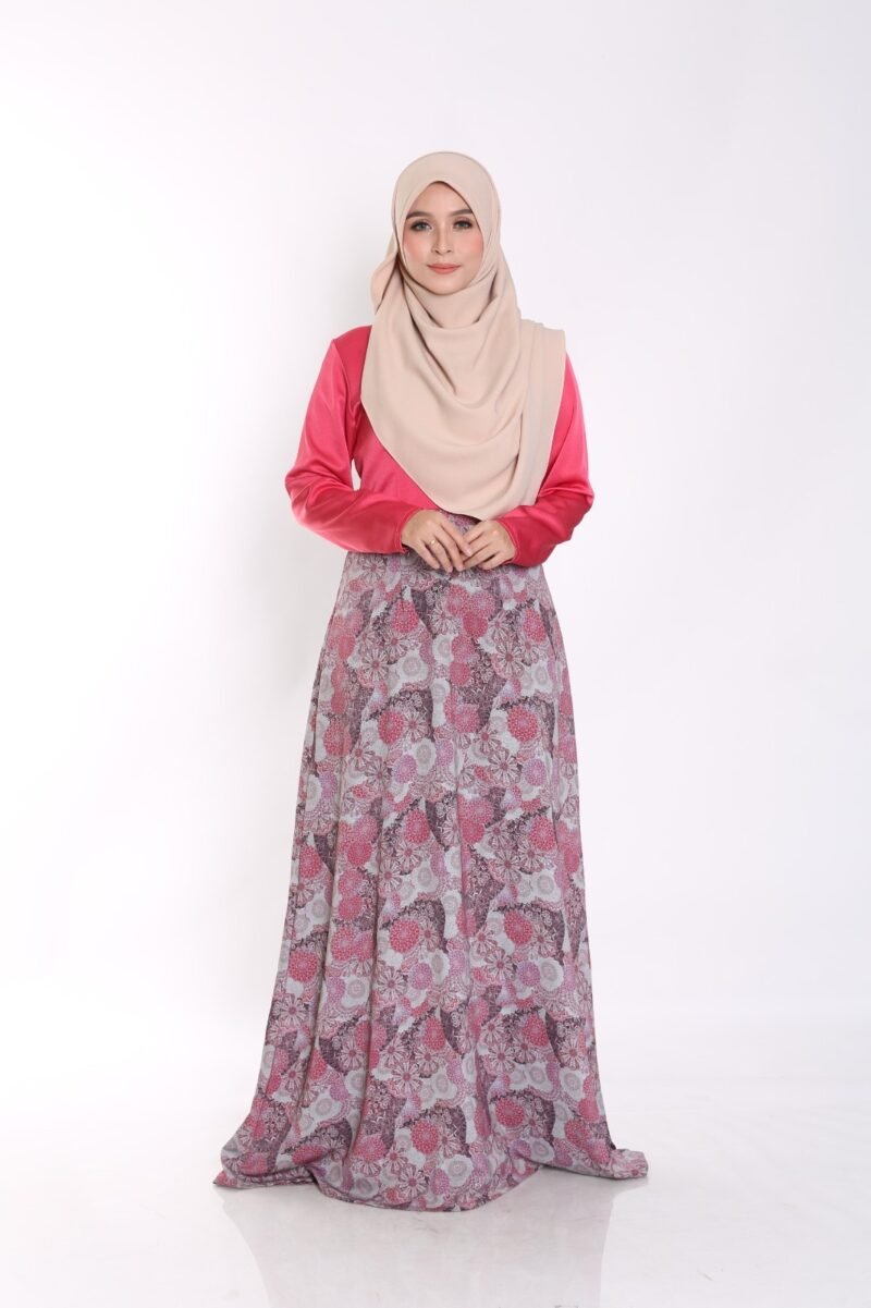 This elegant jubah features a minimalist solid top paired with a flowy floral skirt, creating a flattering and feminine silhouette. Designed for comfort and effortless style, it drapes beautifully with every movement.