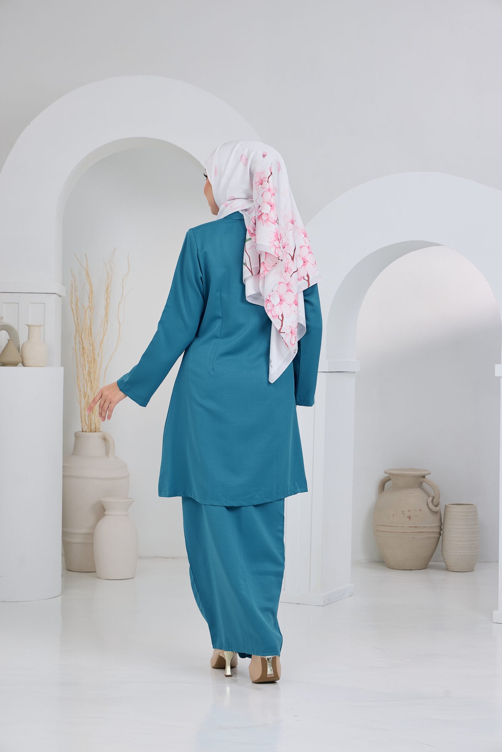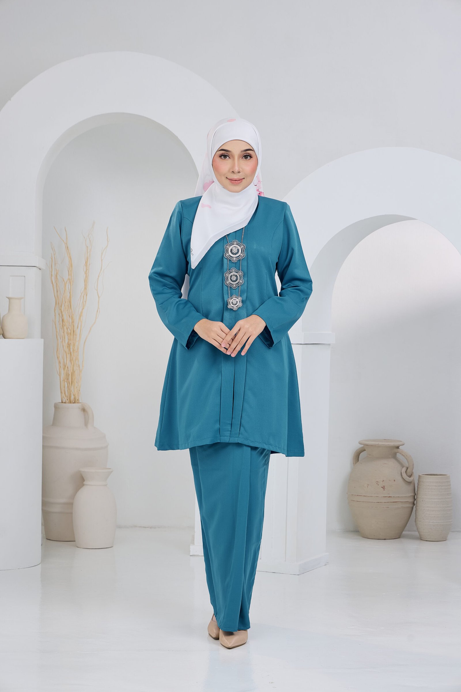 Kebaya Aisyah is designed for women who appreciate graceful structure paired with soft, flowing elegance. Featuring a clean A-line silhouette with a refined front panel and subtle pleated detailing, this piece creates a flattering visual line that elongates the body while maintaining a polished, sophisticated finish.