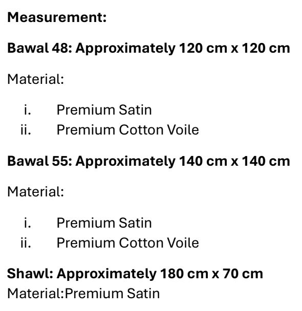 Shawl Satin, Bawal Satin 48', Bawal Satin 55'