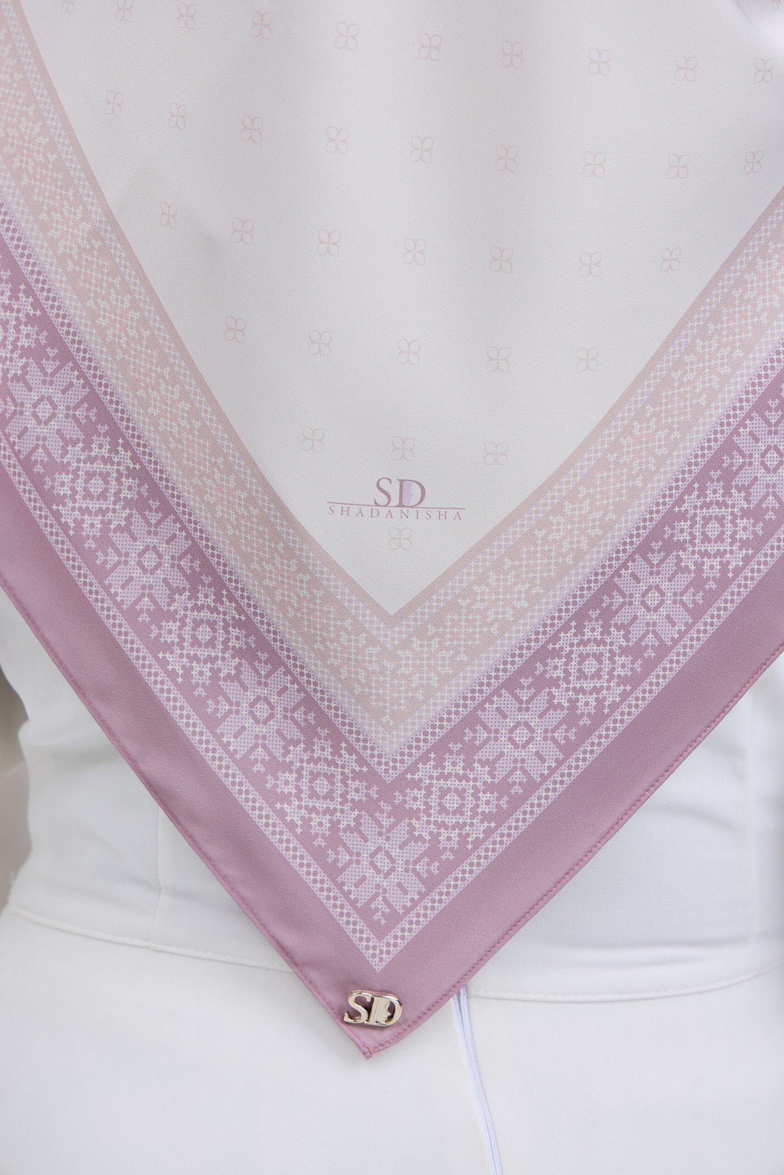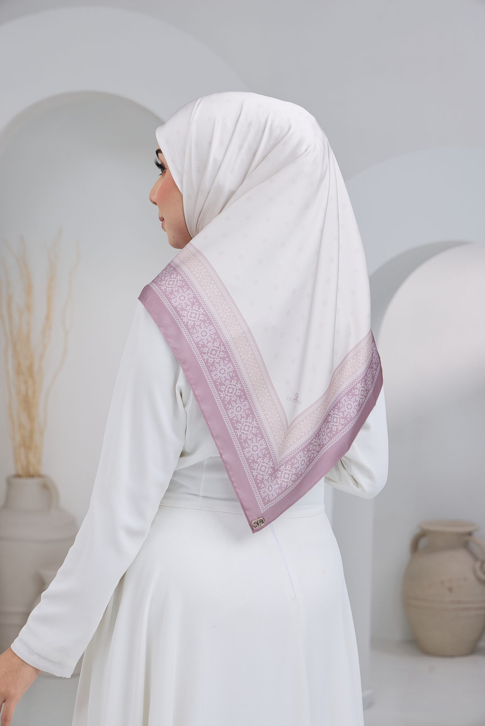 Puteri Aqilah embodies understated luxury with a soft monogram-inspired base and a refined geometric border that frames the design with elegance. The subtle all-over pattern creates a clean and polished look, allowing the details to shine without overwhelming the overall aesthetic.