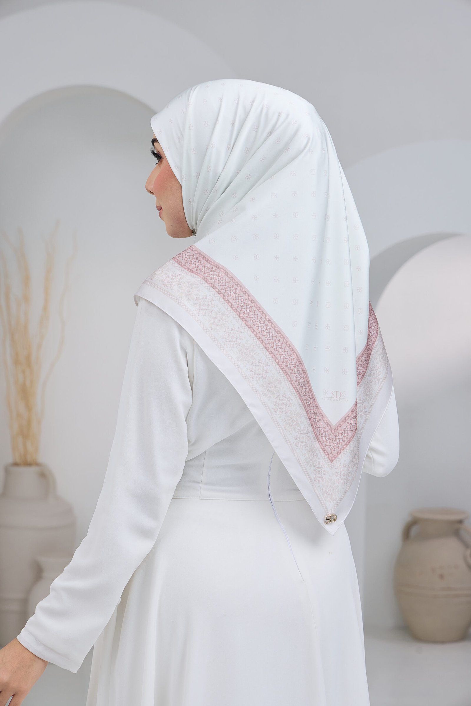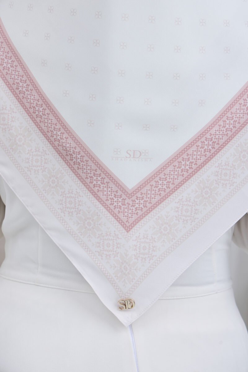 Puteri Aqilah embodies understated luxury with a soft monogram-inspired base and a refined geometric border that frames the design with elegance. The subtle all-over pattern creates a clean and polished look, allowing the details to shine without overwhelming the overall aesthetic.