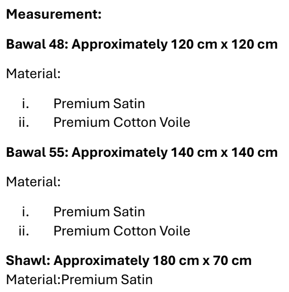 | Material & Size: No selection | Shawl Satin, Bawal Satin 48', Bawal Satin 55' |