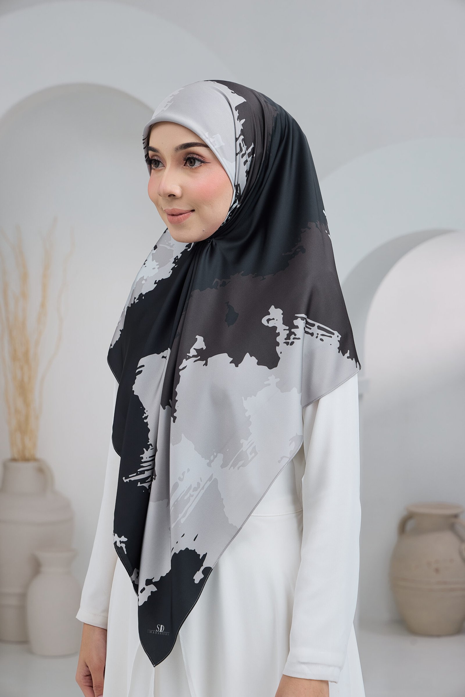 Puteri Diana embodies modern elegance through soft, abstract brushstroke patterns layered in warm neutral and blush tones. The artistic composition creates a refined, contemporary look that feels effortlessly luxurious and versatile for any occasion.