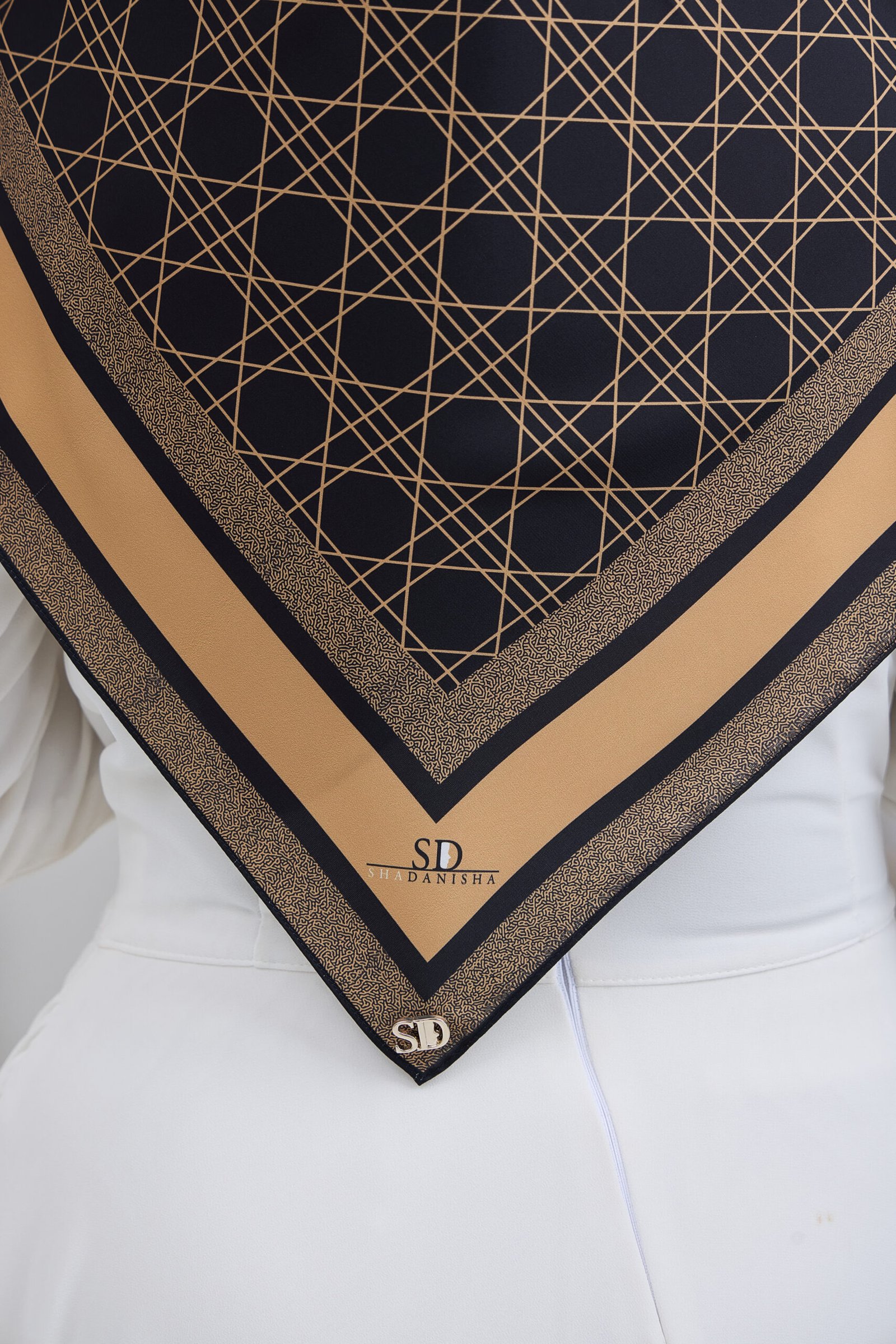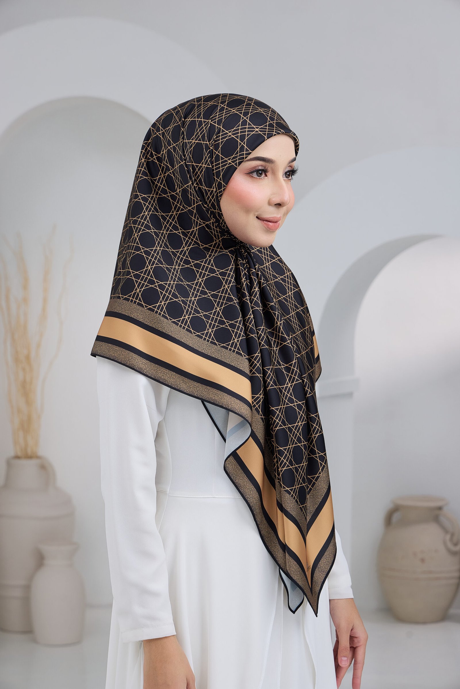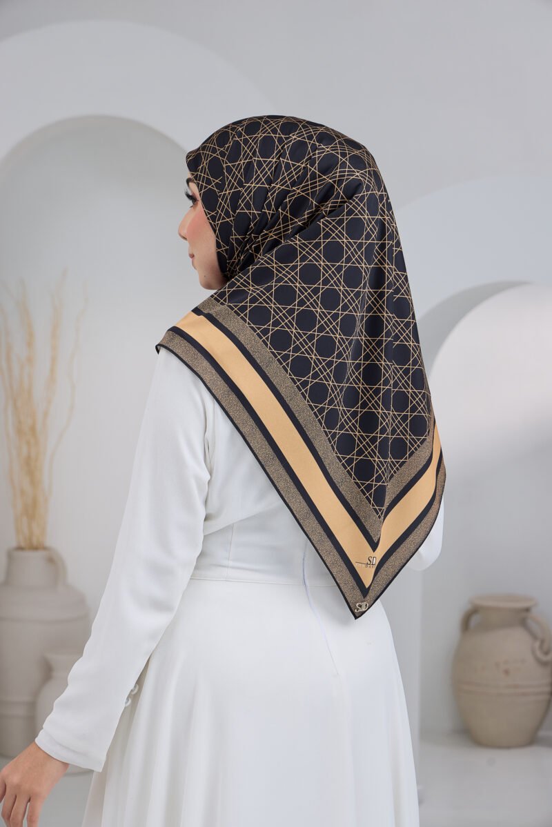 Puteri Qalish reflects modern elegance through a clean geometric composition and a refined layered border. The structured line pattern across the base creates a contemporary and polished aesthetic, while the contrasting border frames the design beautifully for a balanced and sophisticated finish.