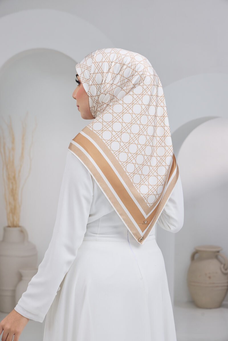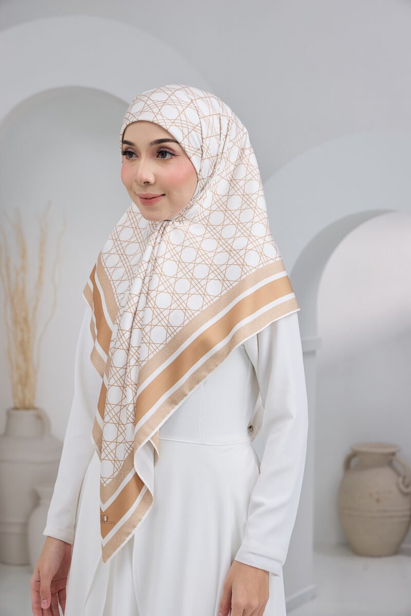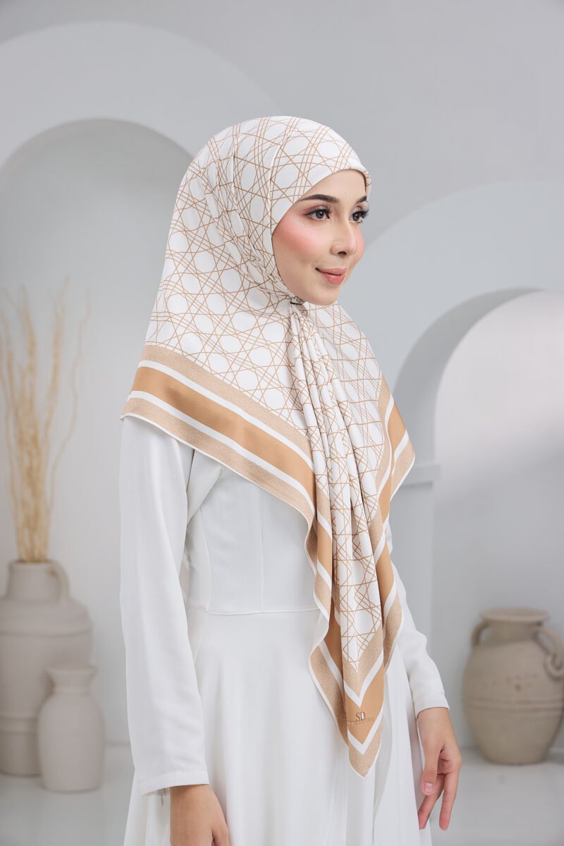 Puteri Qalish reflects modern elegance through a clean geometric composition and a refined layered border. The structured line pattern across the base creates a contemporary and polished aesthetic, while the contrasting border frames the design beautifully for a balanced and sophisticated finish.