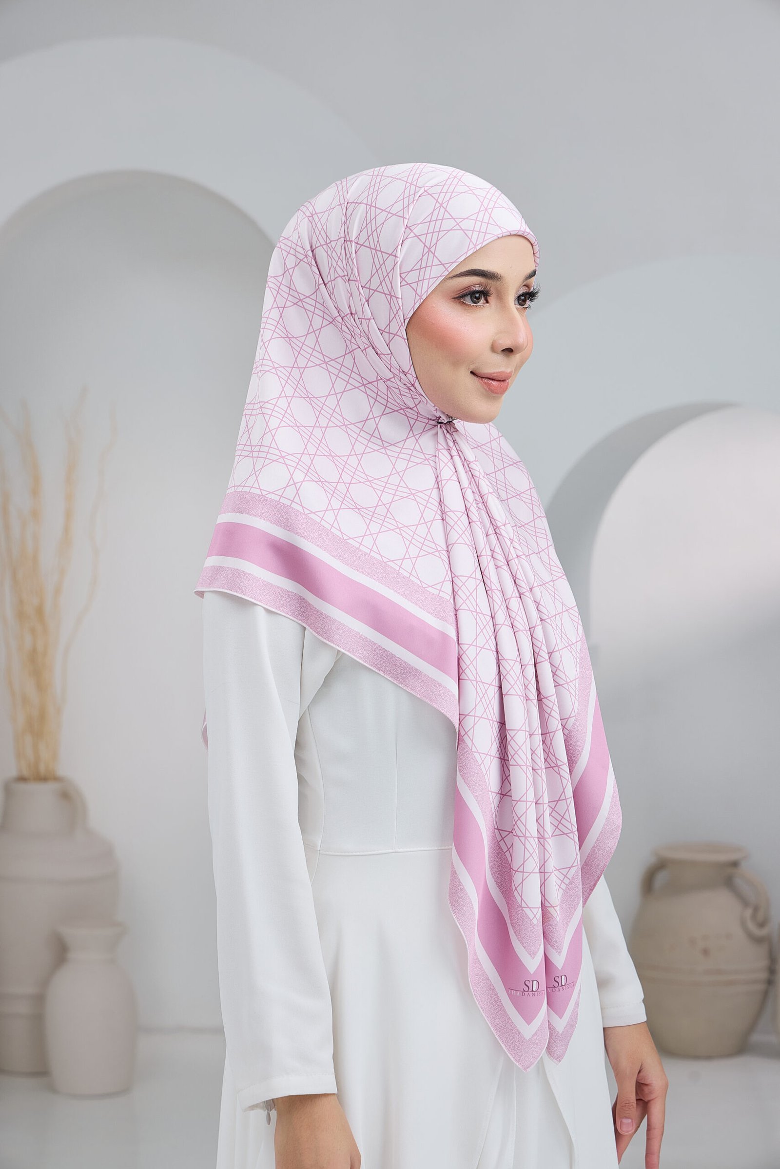 Puteri Qalish reflects modern elegance through a clean geometric composition and a refined layered border. The structured line pattern across the base creates a contemporary and polished aesthetic, while the contrasting border frames the design beautifully for a balanced and sophisticated finish.