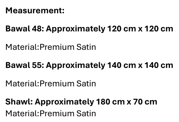 | Material & Size: No selection | Shawl Satin, Bawal Satin 48', Bawal Satin 55' |
