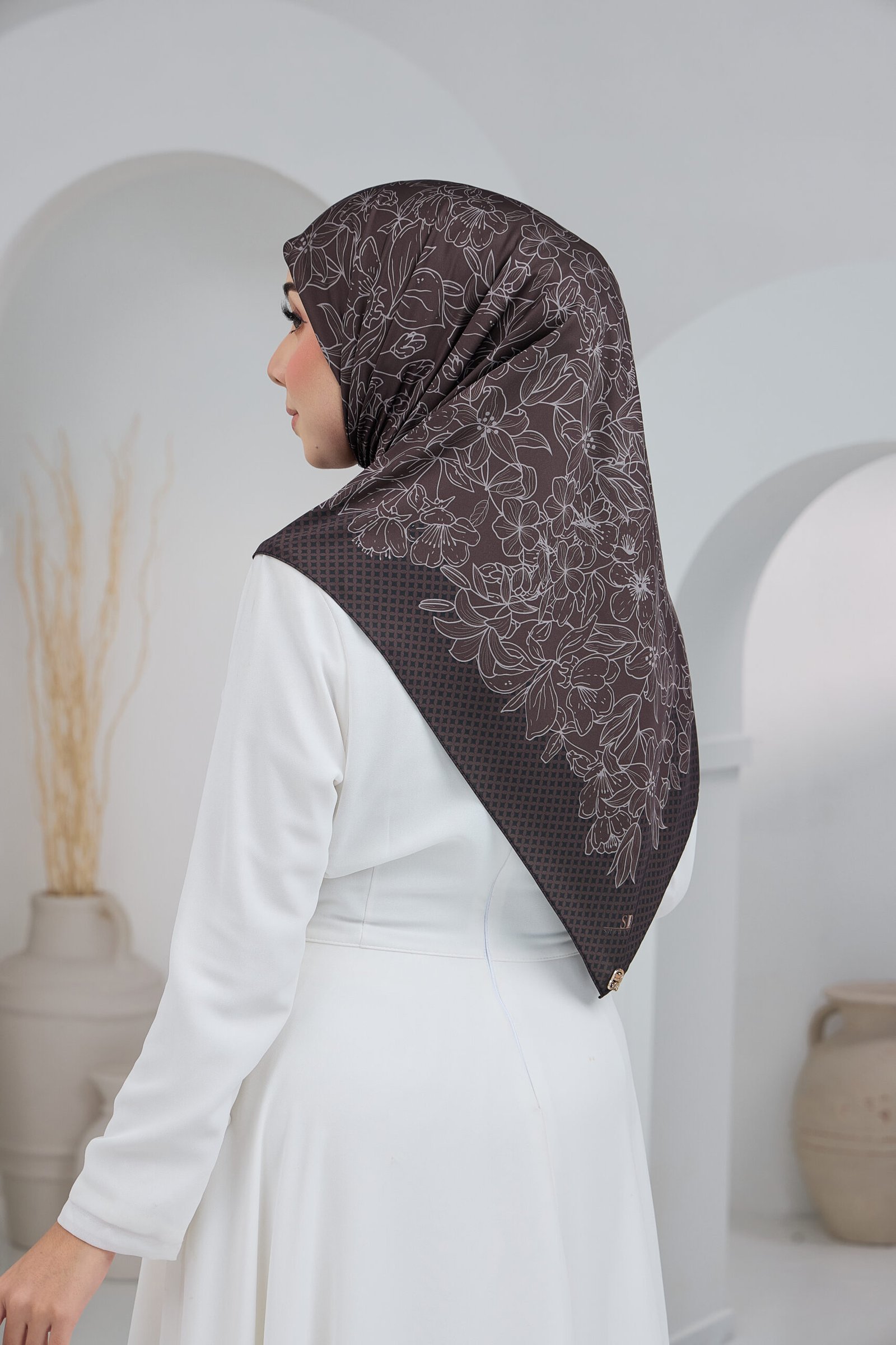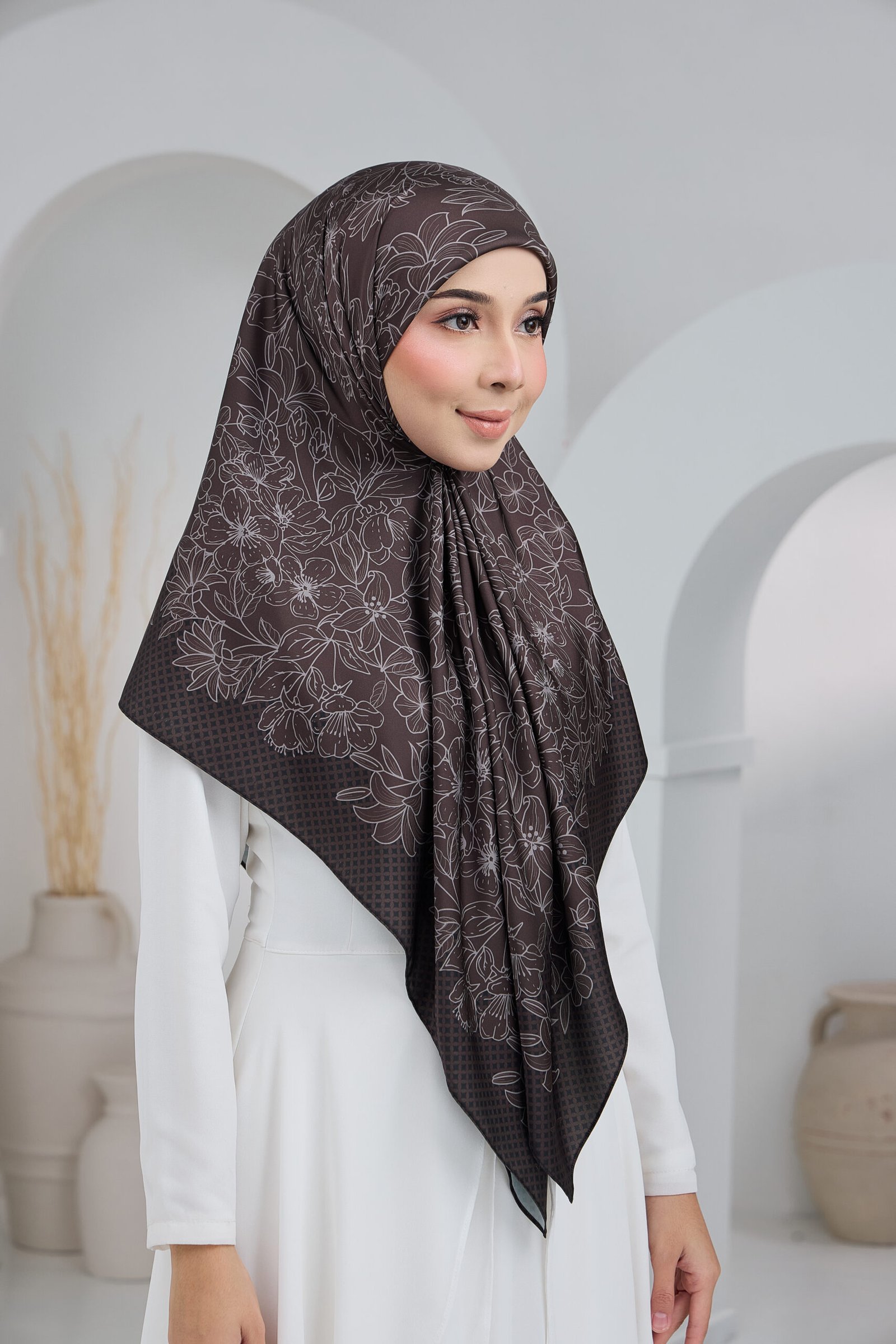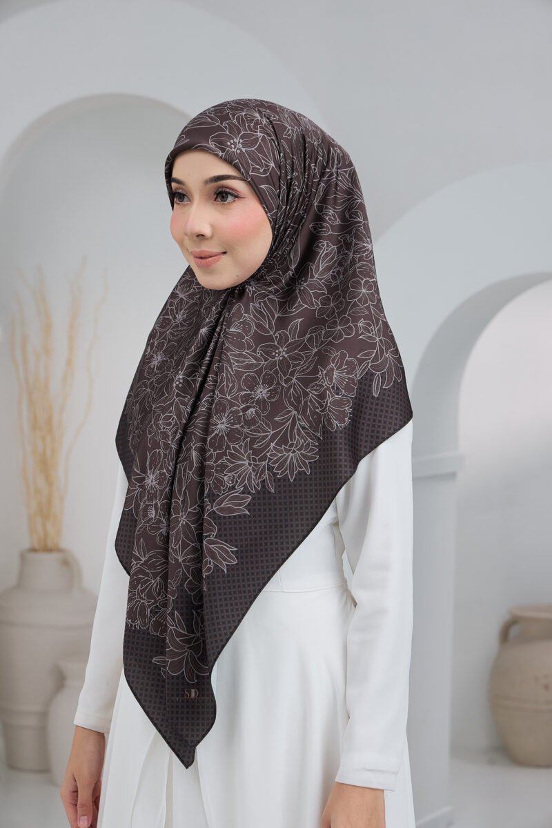 Puteri Sarah is designed with an elegant floral line-art motif layered over a subtle geometric base, creating a refined balance between softness and structure. The flowing floral arrangement adds a graceful, feminine touch, while the patterned background enhances depth and visual interest for a polished, premium look.